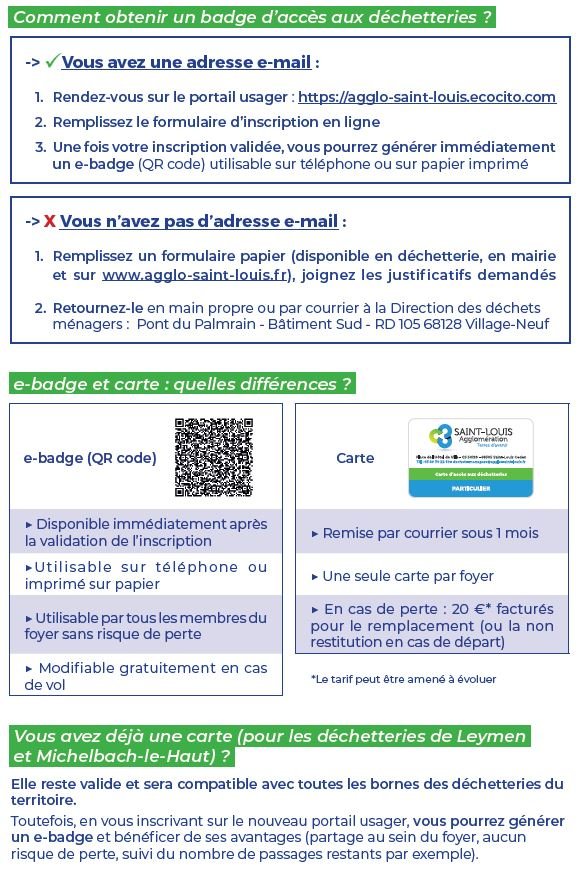 Sur leur site internet (www.agglo-saint-louis.fr) se trouve un guide explicatif complet comprenant un tutoriel pour l’inscription sur le portail usager. Voici le lien vers le guide complet : guide-badges-dechetteries-2025.pdf